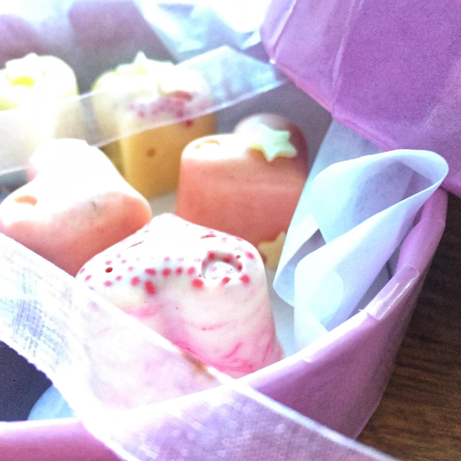 7. Turn them out of the moulds. If you want to add extra sprinkles to the top, melt a little chocolate and use it to glue them in place. Finally, find or make a lovely box and enjoy giving your unique chocolates to someone special.