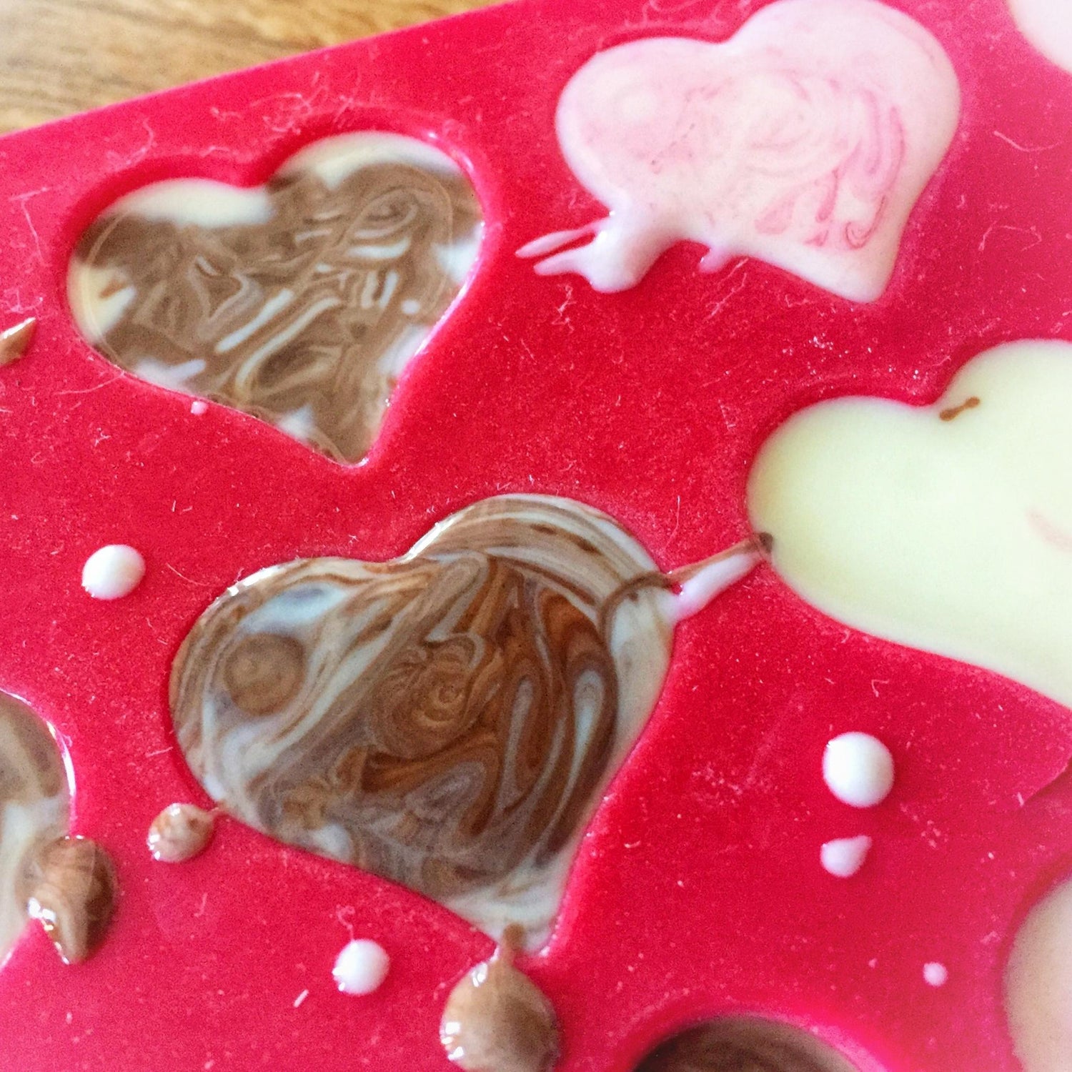 4. We added a little bit of the different chocolate mixtures to the moulds and used a cocktail stick to make sure there were no trapped air bubbles. You can also make a marbled effect with the different colours by swirling it around gently.