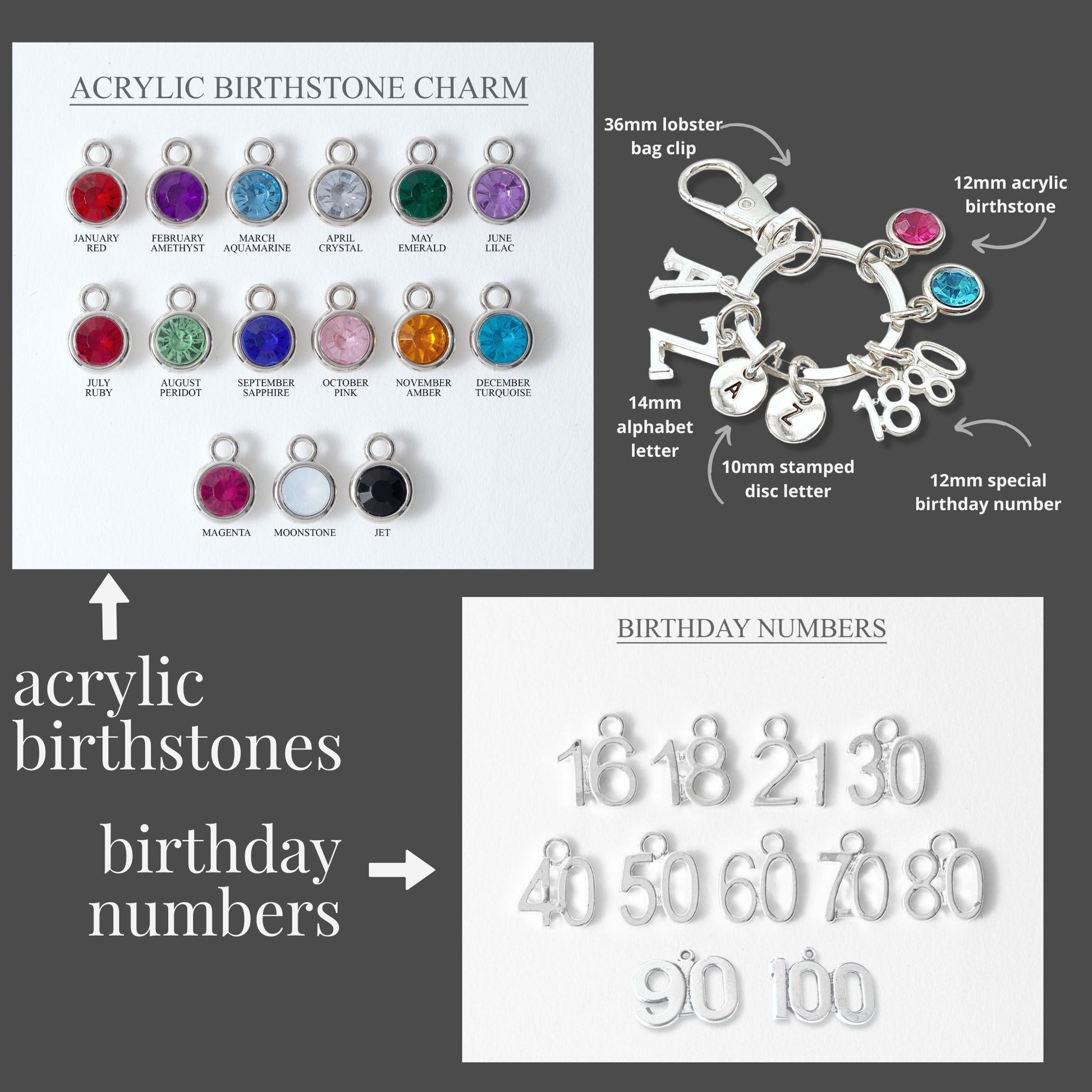 • 12mm acrylic gem in birthstone colours