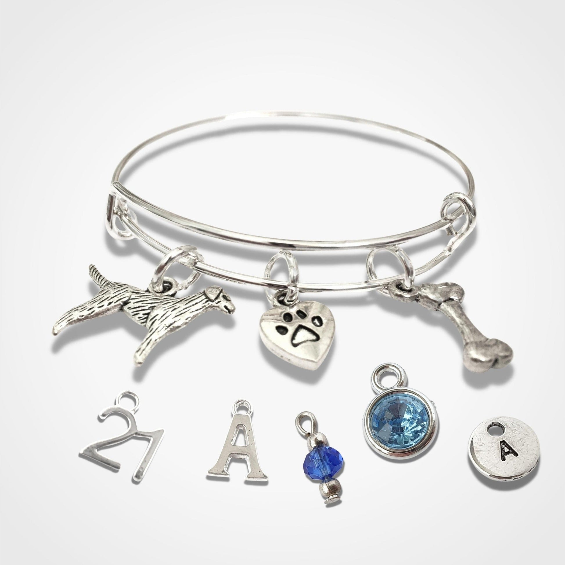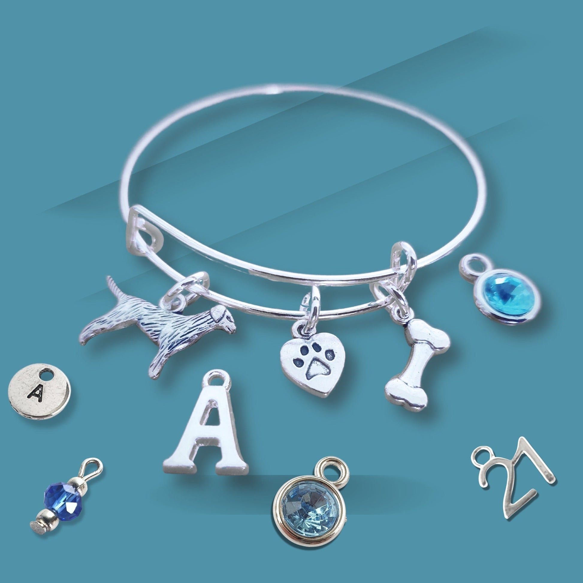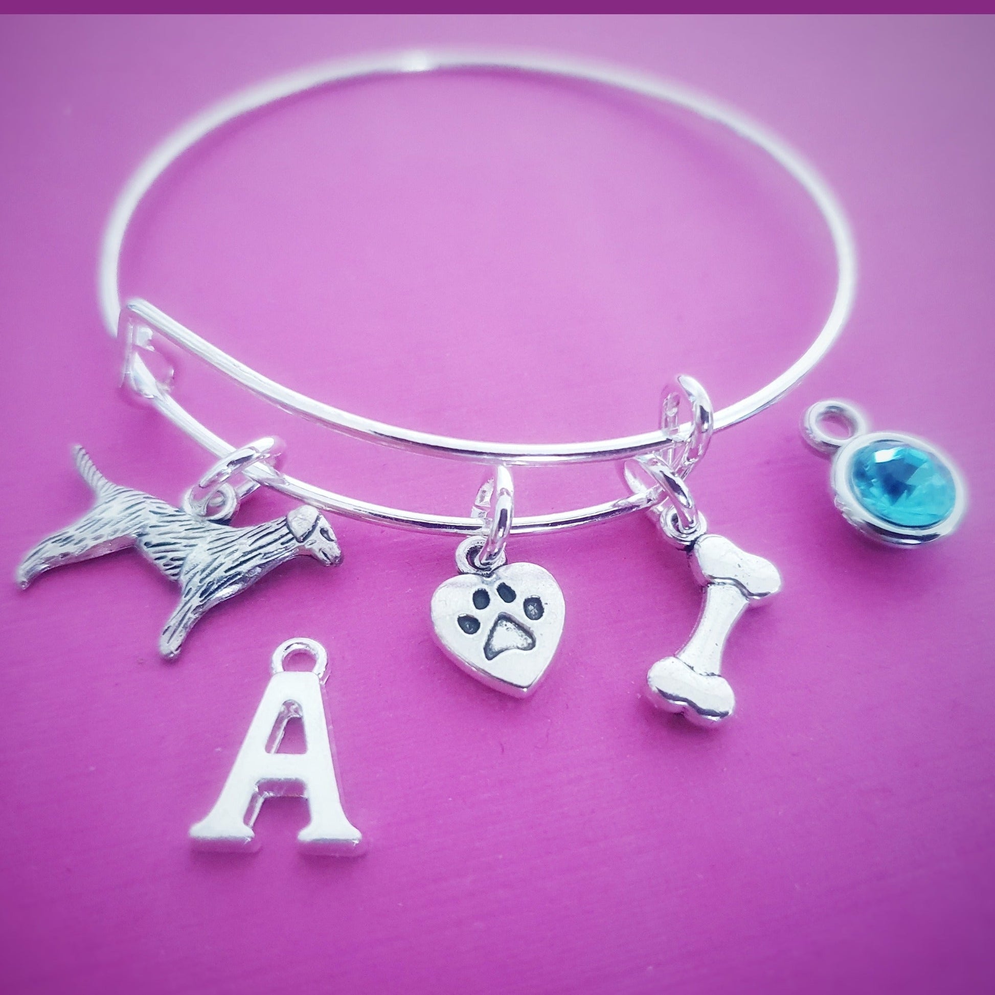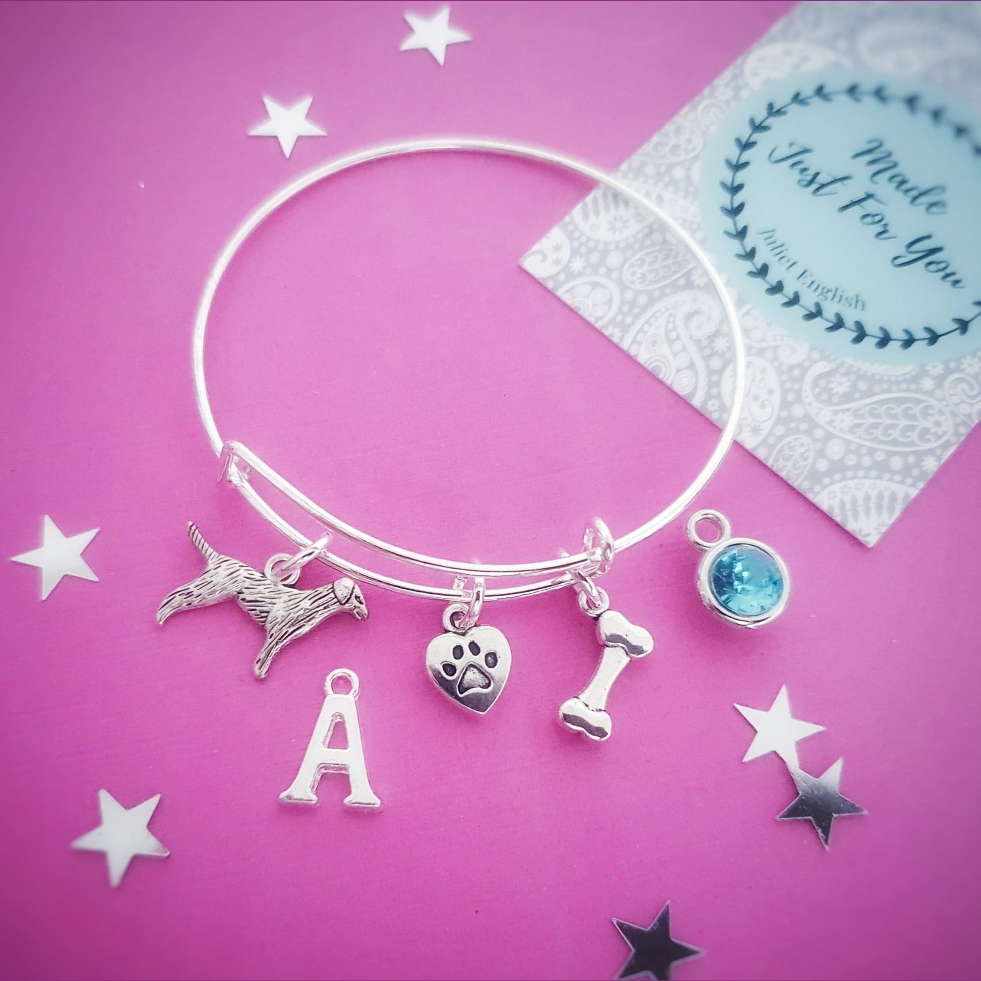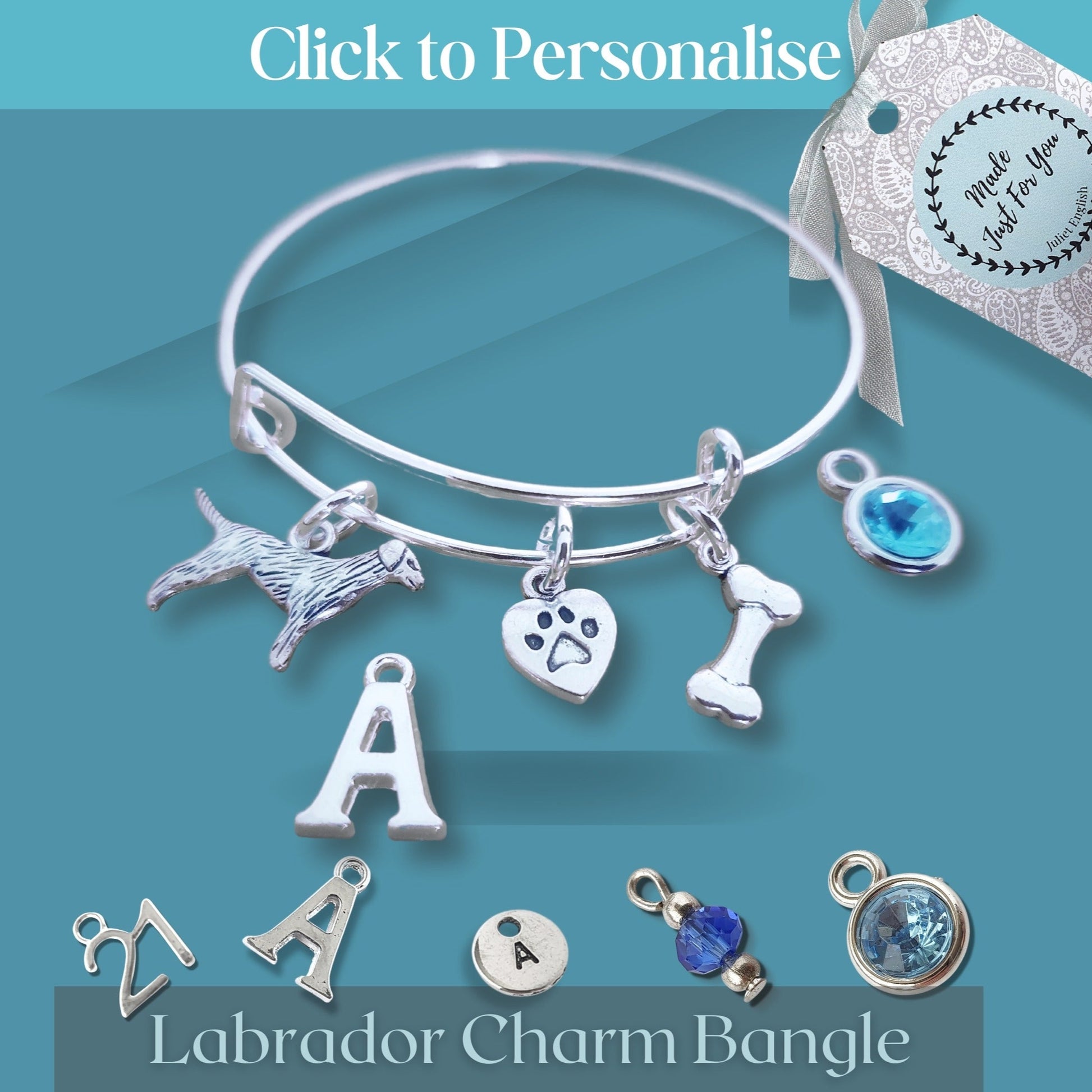Silver plated labrador bangle. Labrador retriever and vizsla lovers will adore this super cute silver plated bangle with dog theme charms. Gorgeous adjustable bangle to give as a gift to your dog loving friends or to keep for yourself. This sweet bracelet features a labrador, retriever, pointer, gun dog charm. It is poised ready to fetch!