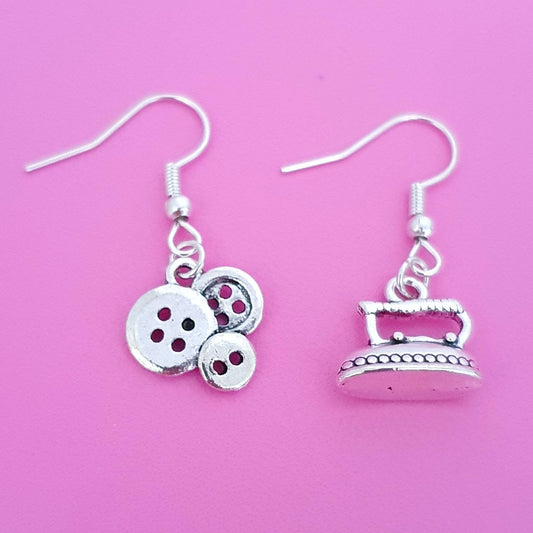 Clothes Iron and Buttons Earrings - Silver