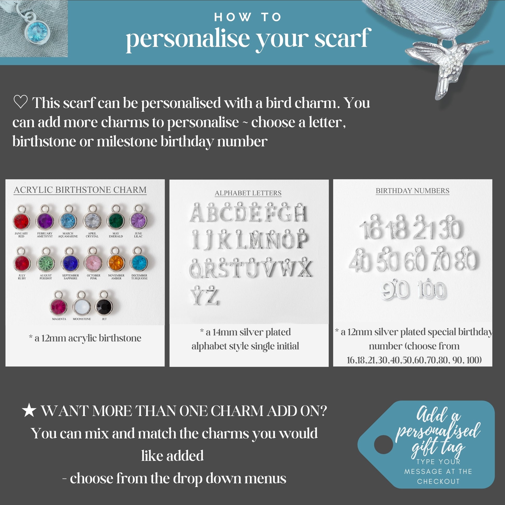 Choose extra charms attached with a silver plated ring to the corner of the scarf