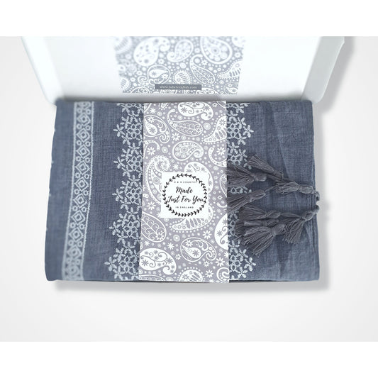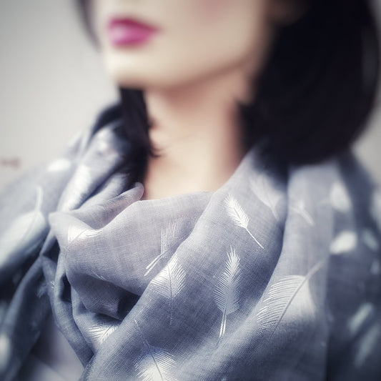 Tie Dye Printed Silver Feathers Scarf - Grey with silver print