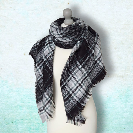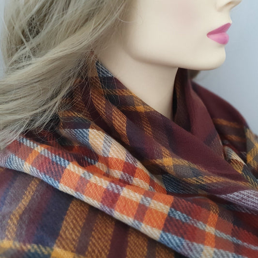 Plaid Blanket Scarf - Burgundy, Orange and Yellow