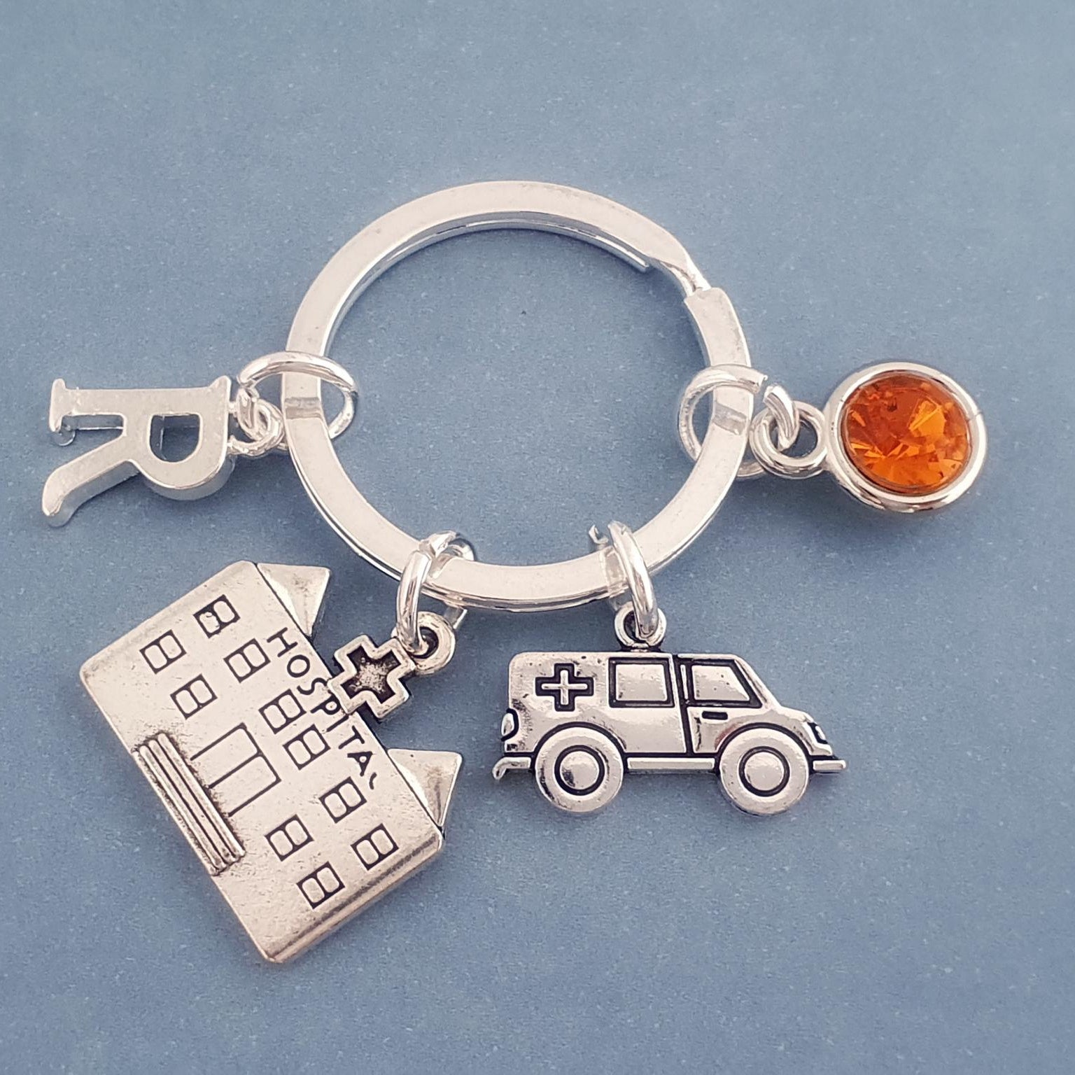 Fun little ambulance keyring with a miniature ambulance and hospital charm. A thoughtful little letterbox gift for an ambulance driver, paramedic, doctor or nurse.