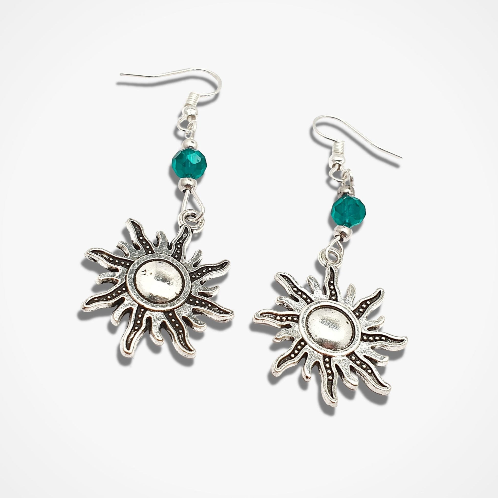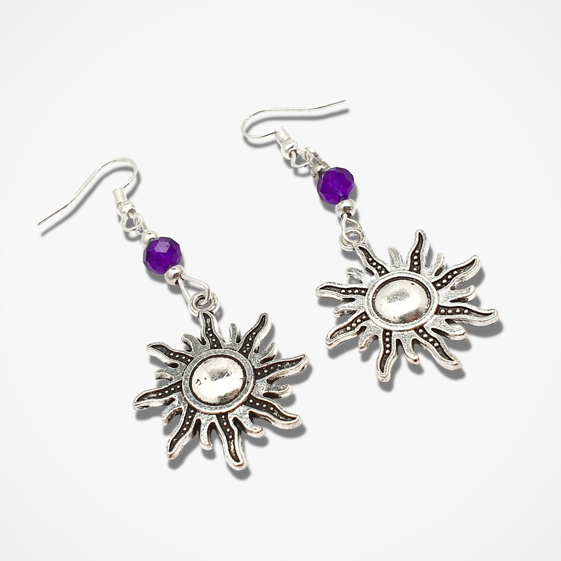 Silver Plated Cosmic Sun earrings, novelty sun dangle earrings.