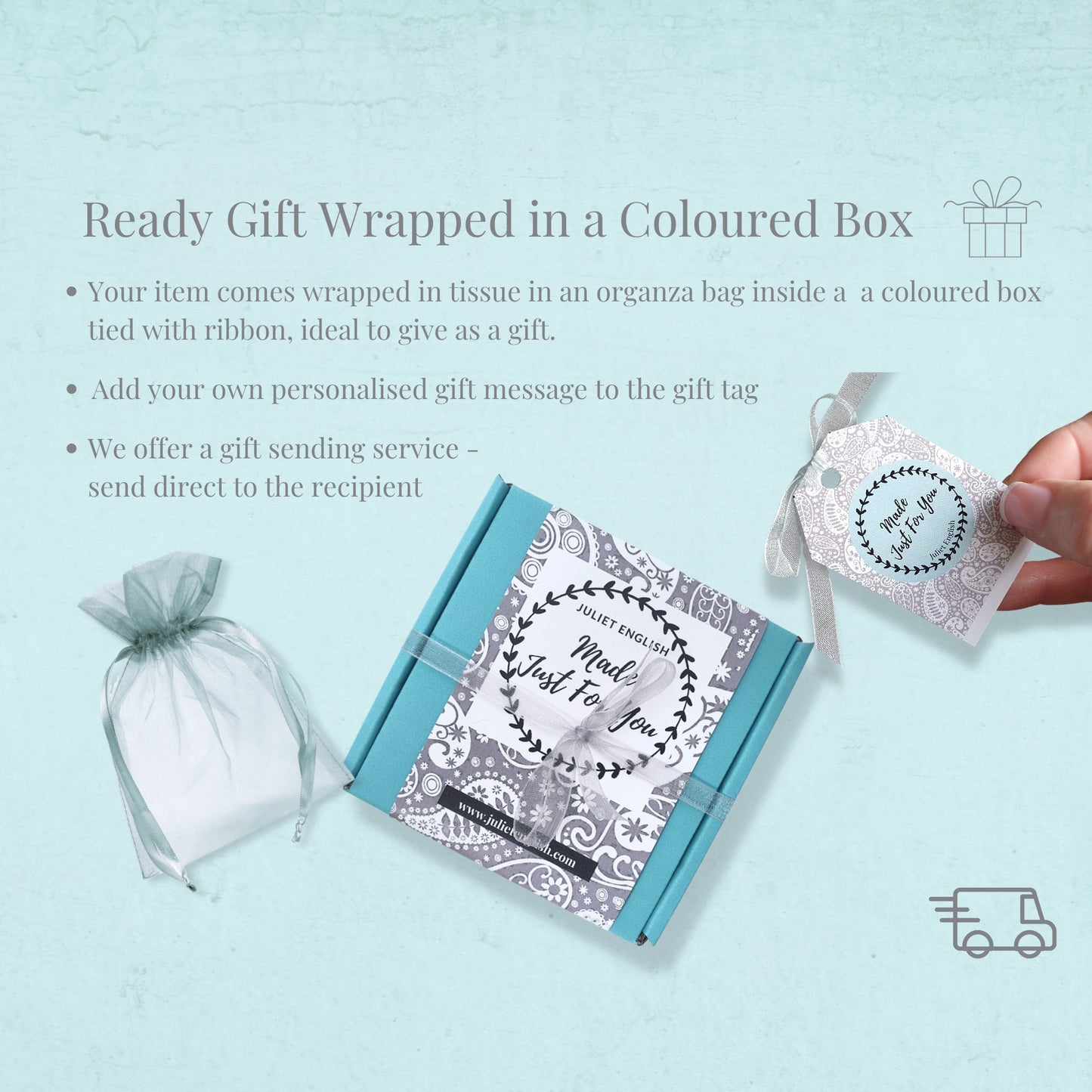 • Ready gift wrapped in tissue, organza bag and coloured box tied with ribbon