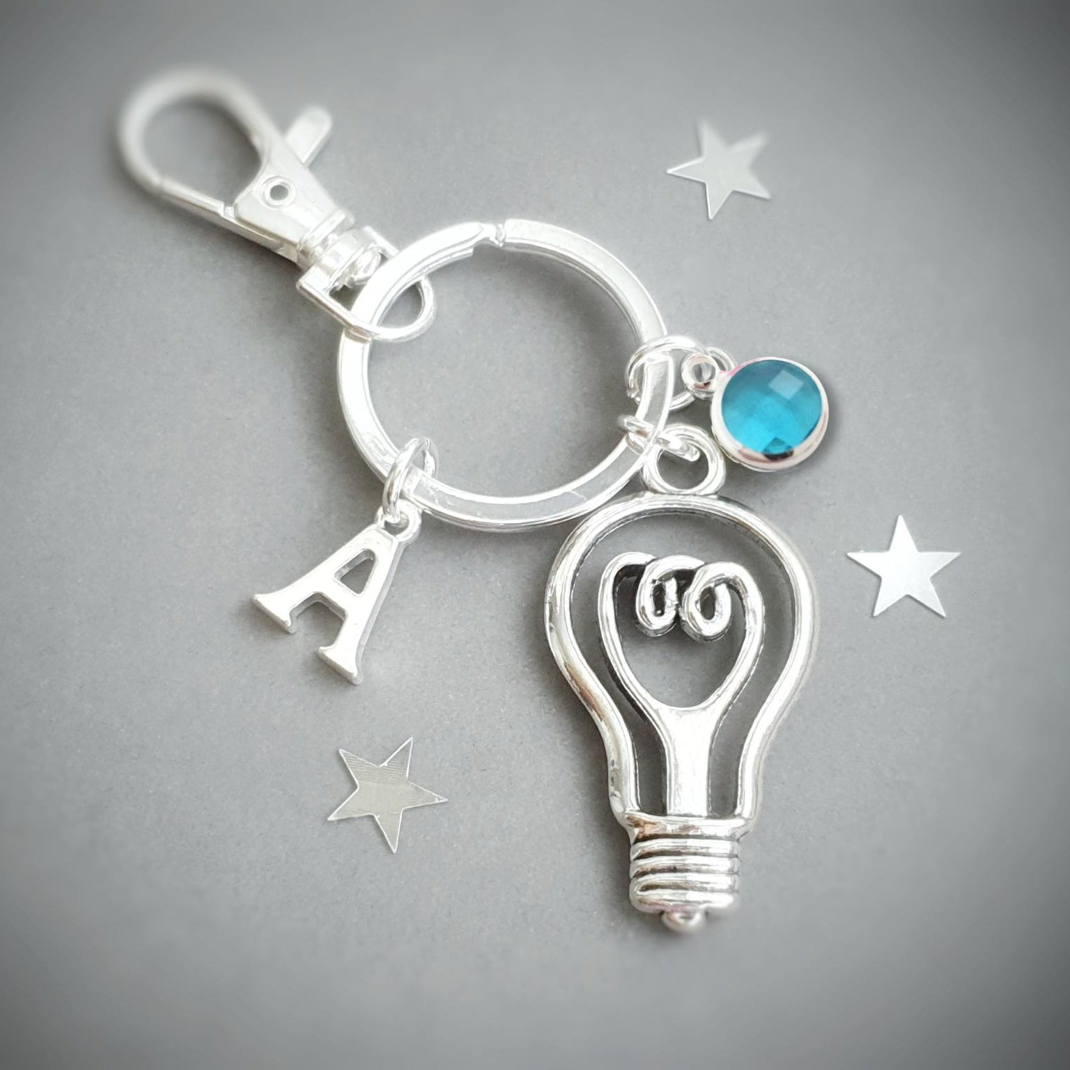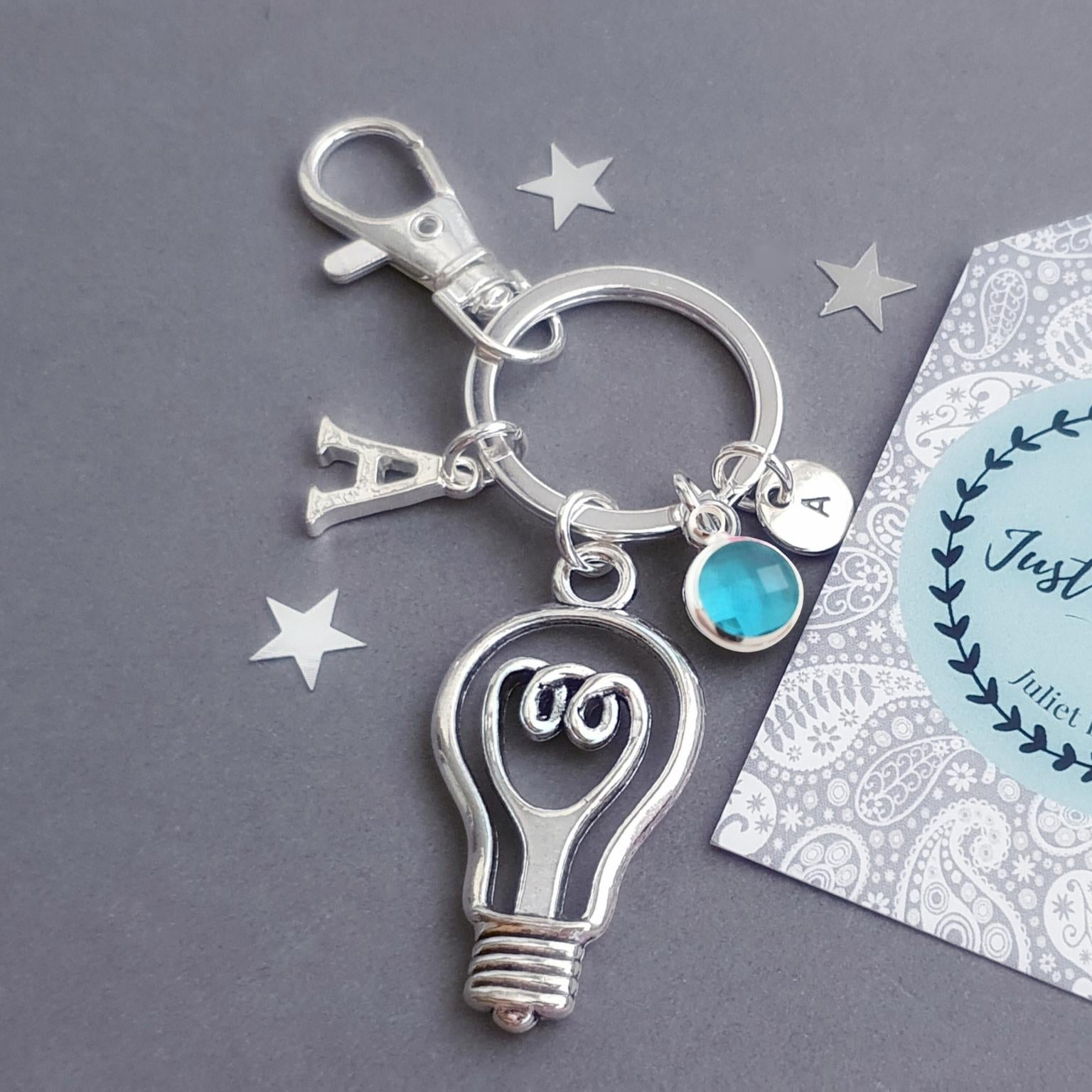 Personalised lightbulb keyring with a miniature lightbulb charm. A lovely little letterbox gift for someone who inspires you or who is the light of your life.
