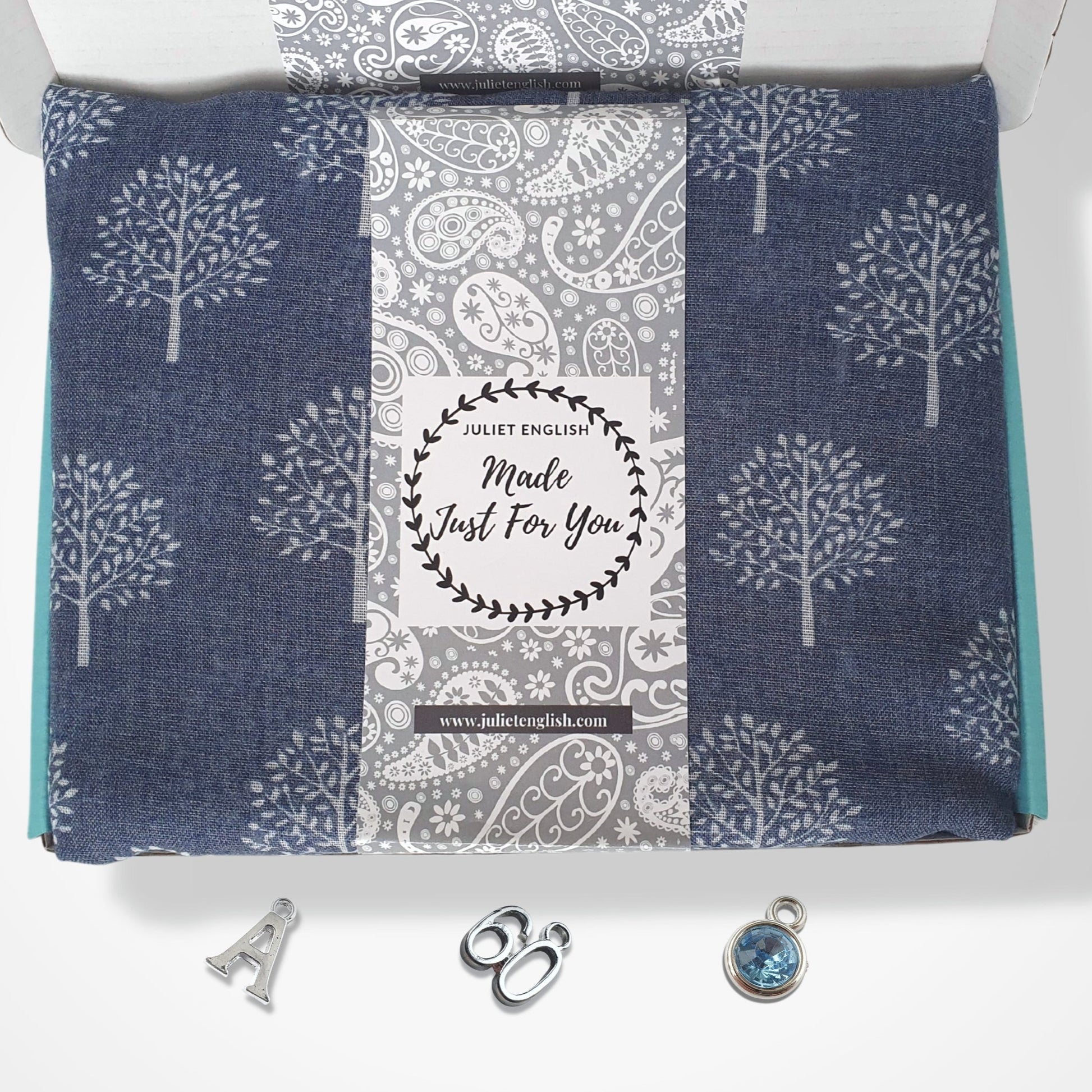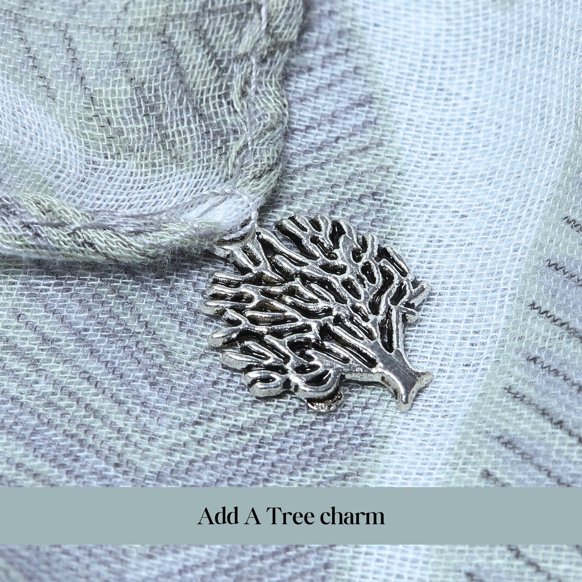 Choose extra charms from the options menu. Charms are attached with a silver plated ring to the corner of the scarf. To add more than one charm, please select the option you require and tell us your choices in the text box.