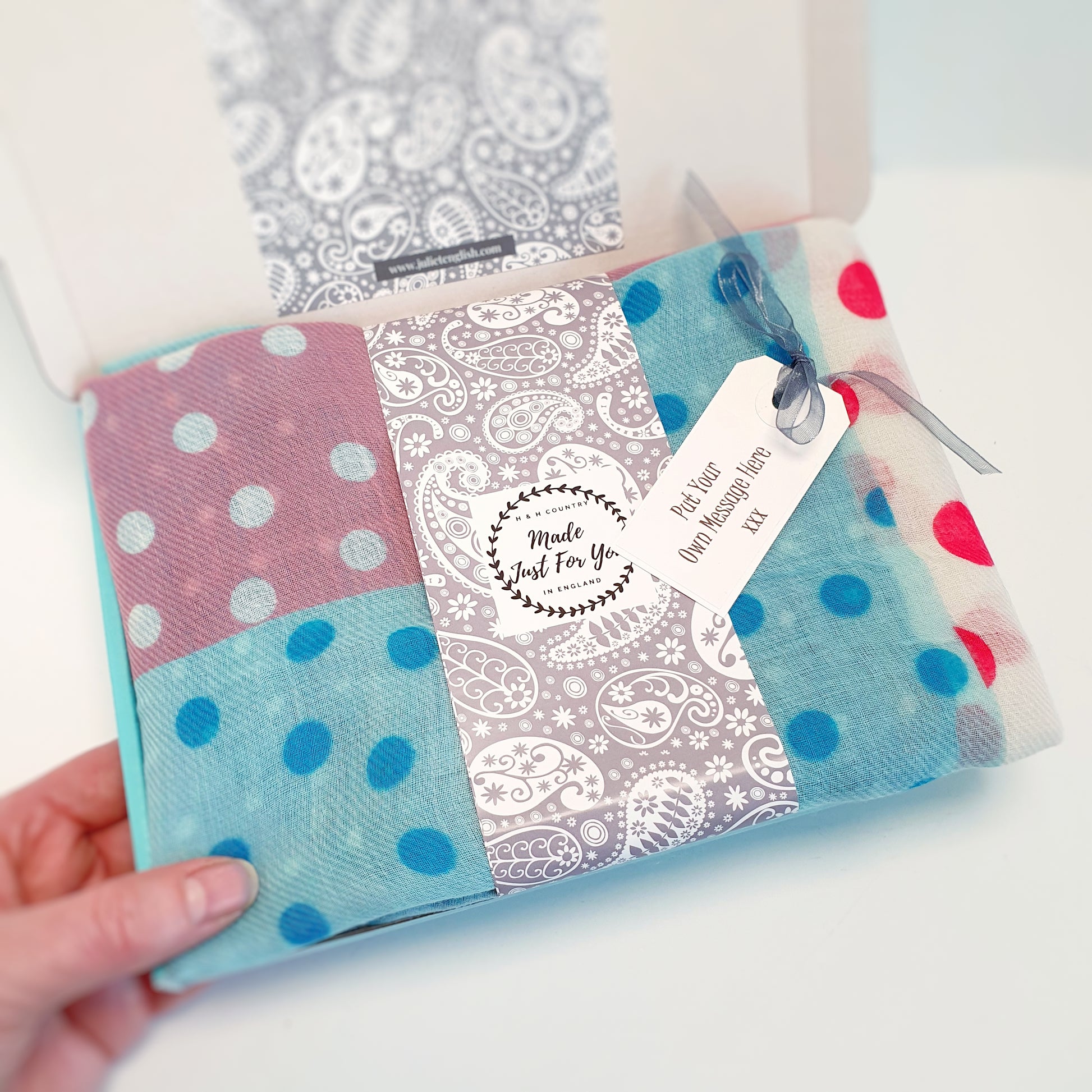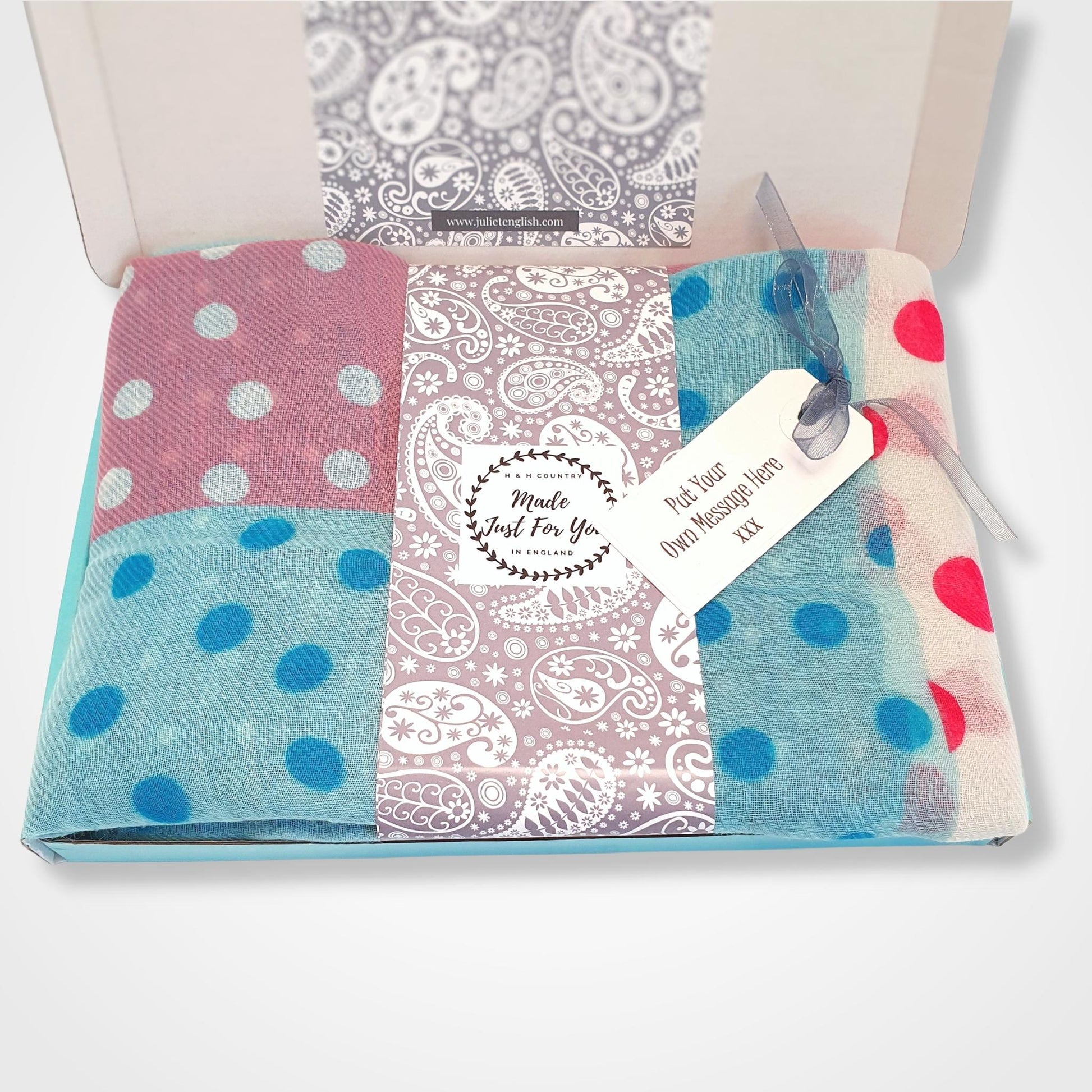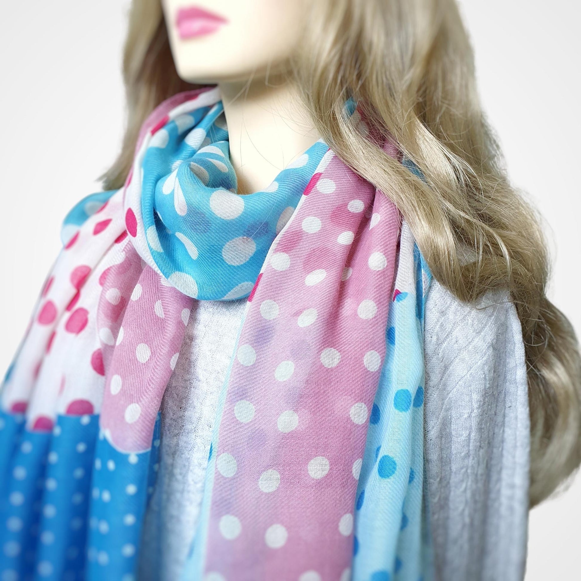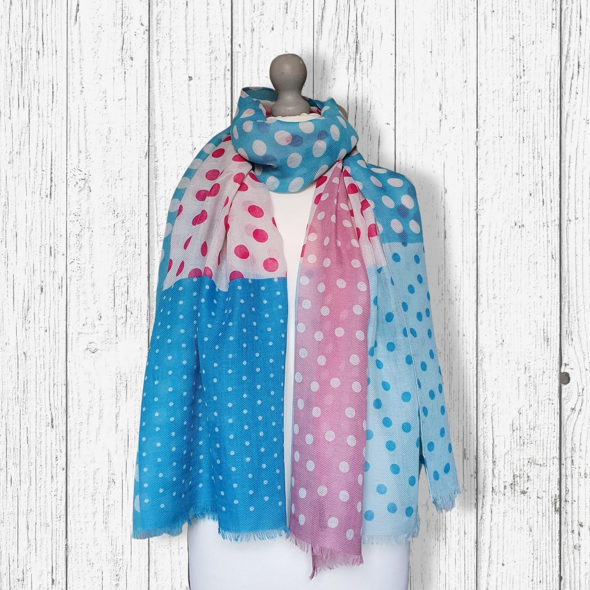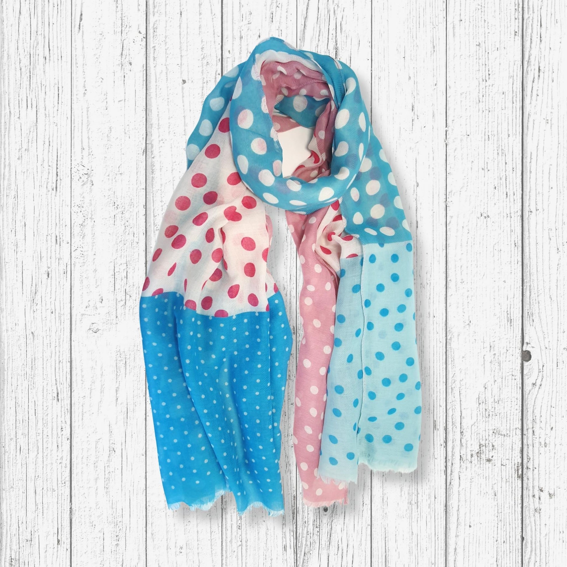 Beautiful oversized scarf with polka dot patchwork print in a medium weight sort polyester. The soft pinks, blues, aqua and off-white create a striking pattern of polka dots in a patchwork. This scarf is super large to keep you cosy. Wear it as a shawl or wrap to enliven your outfit.
