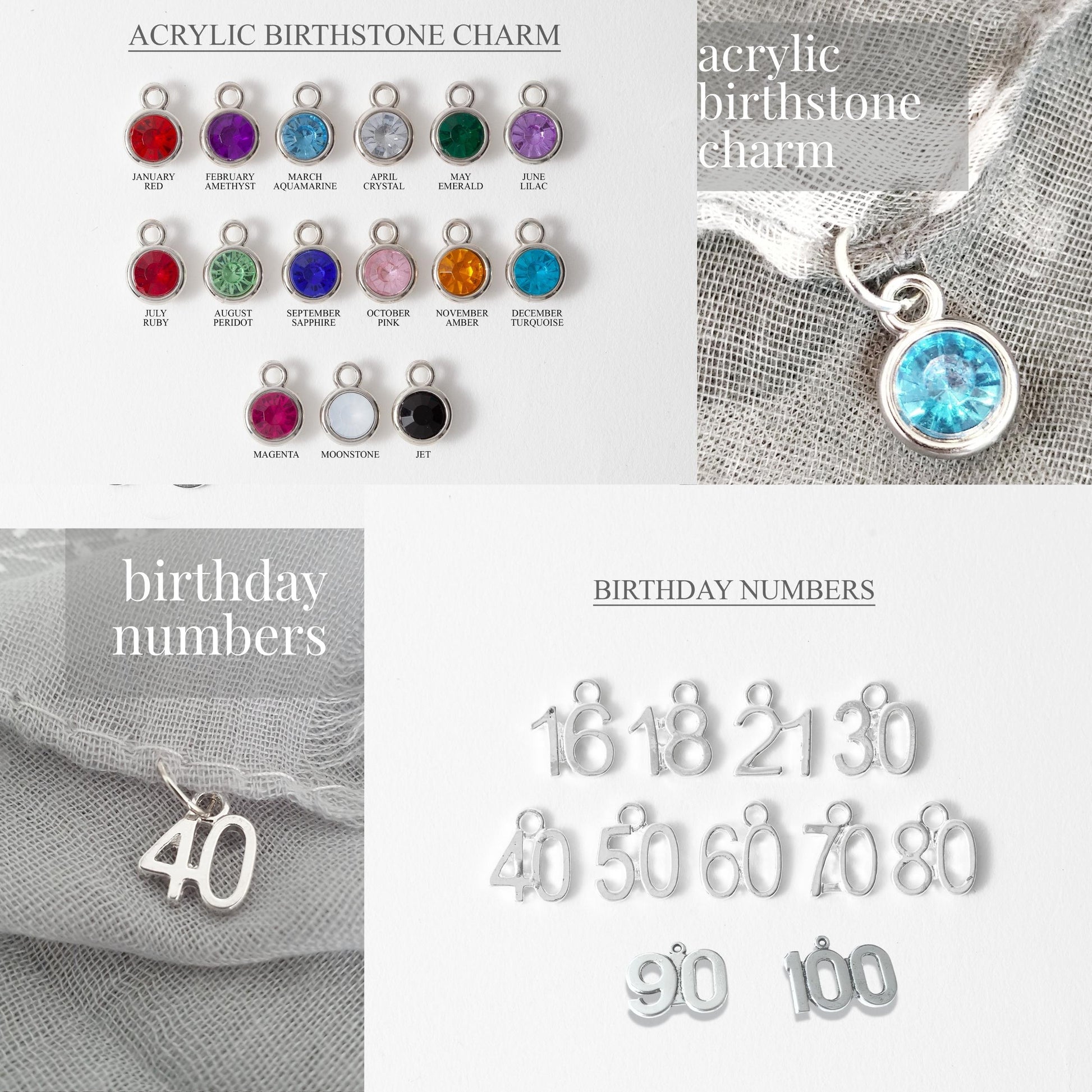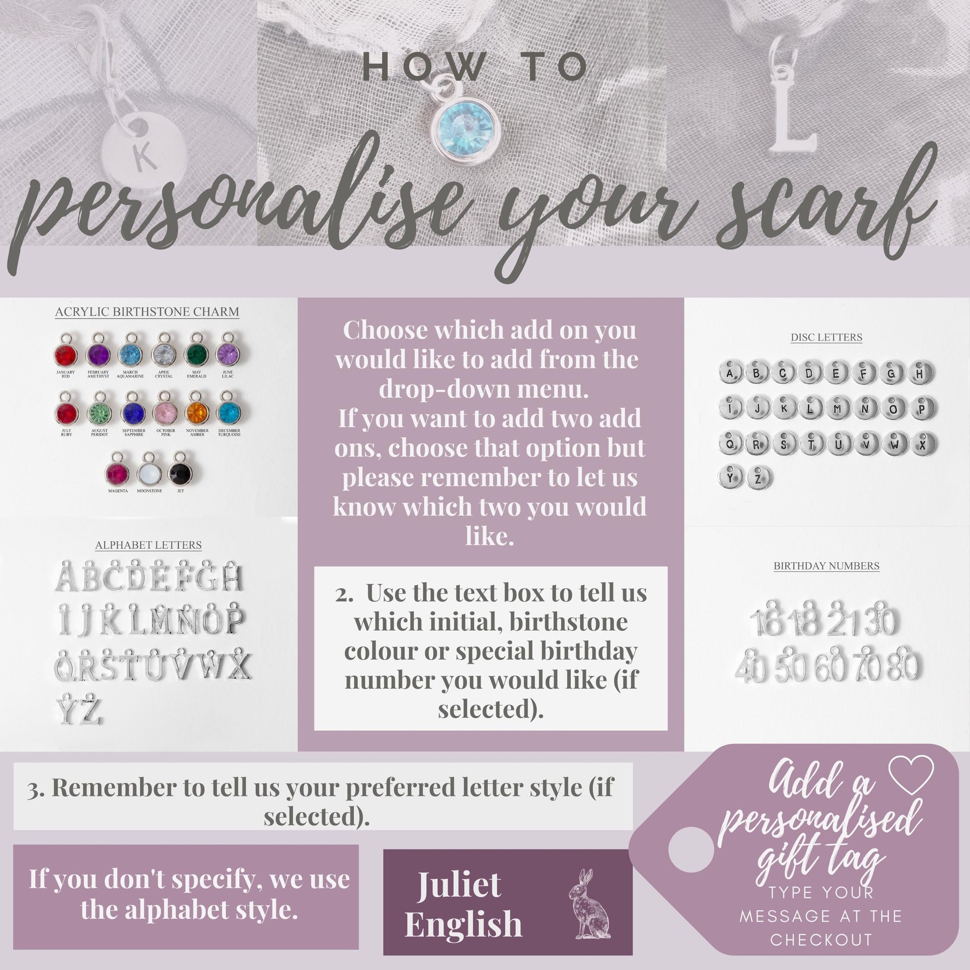 Choose extra charms from the options menu to personalise your scarf. Charms are attached with a silver plated ring to the corner of the scarf