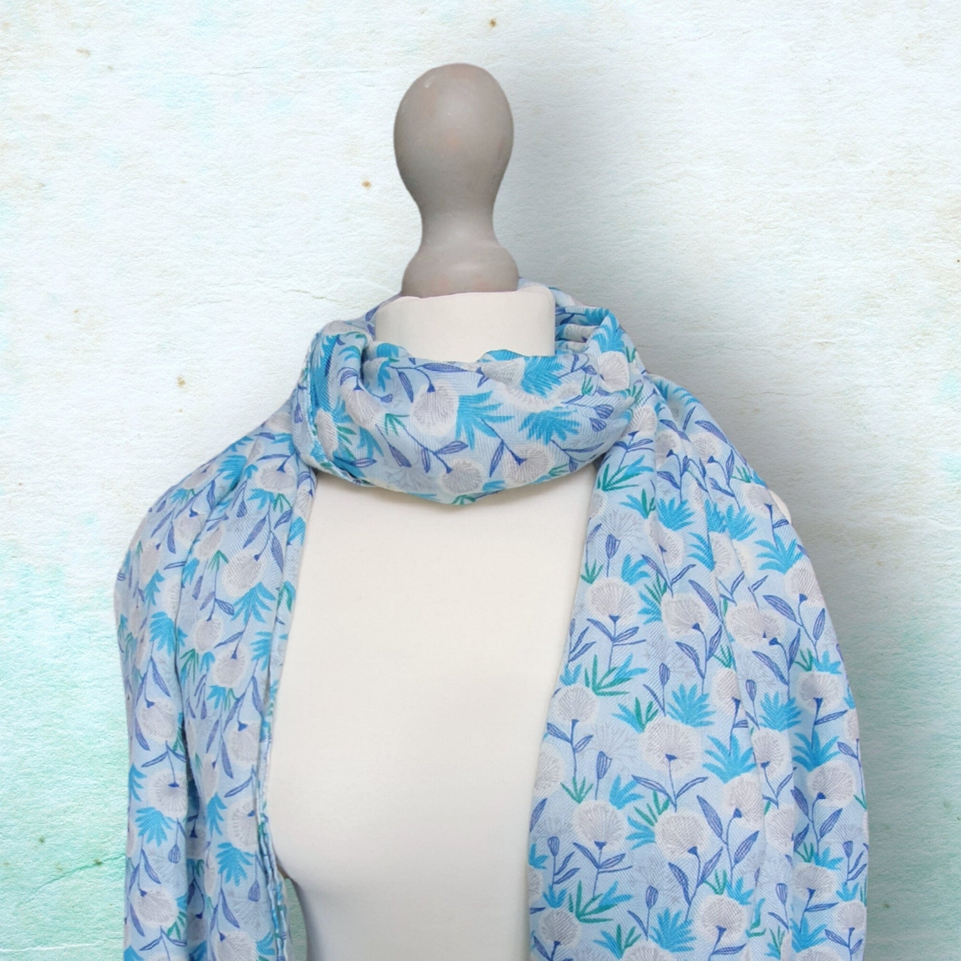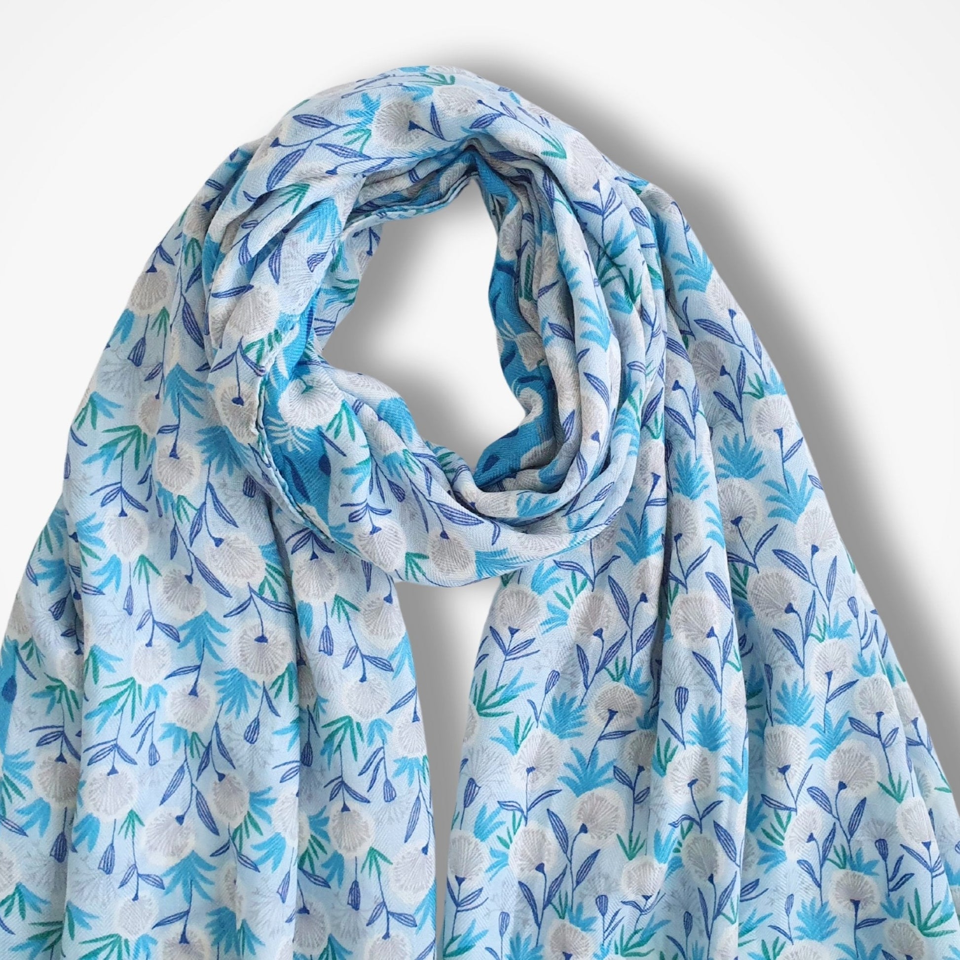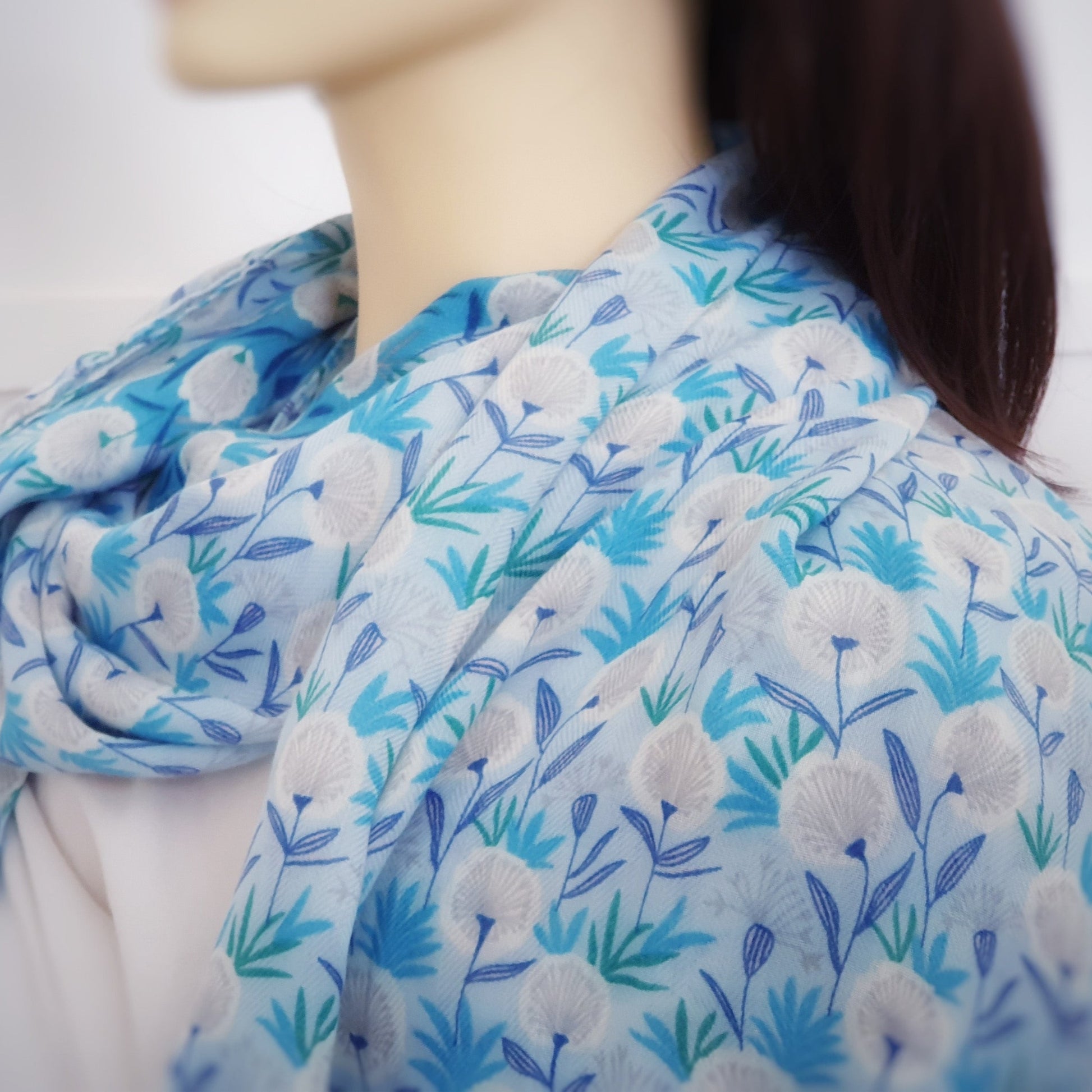 Lovely lightweight scarf adorned with a beautiful floral dandelion print in shades of blue, turquoise, green, white, and grey. Complete with fringe detailing on the shorter edges, this versatile piece is perfect for any occasion - whether it be a special birthday, a thoughtful present for a loved one, or simply a treat for yourself. Perfect for gardeners or anyone who loves nature.