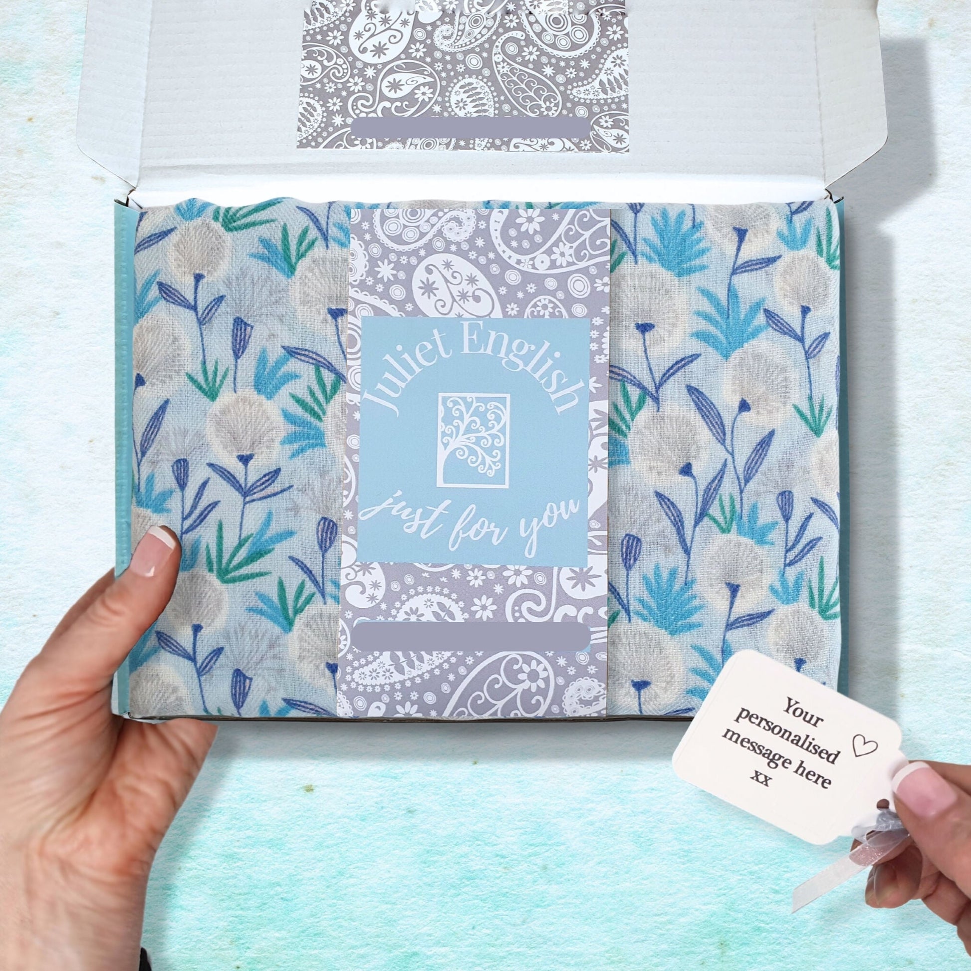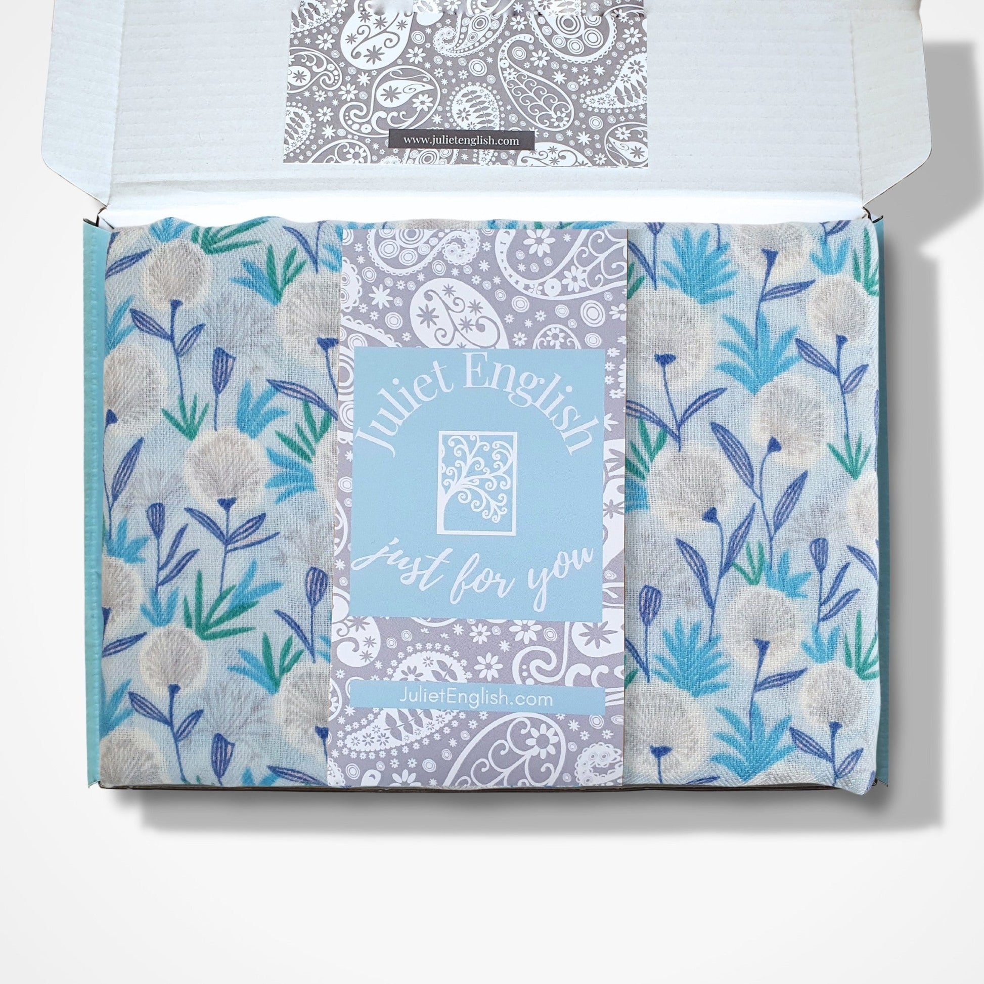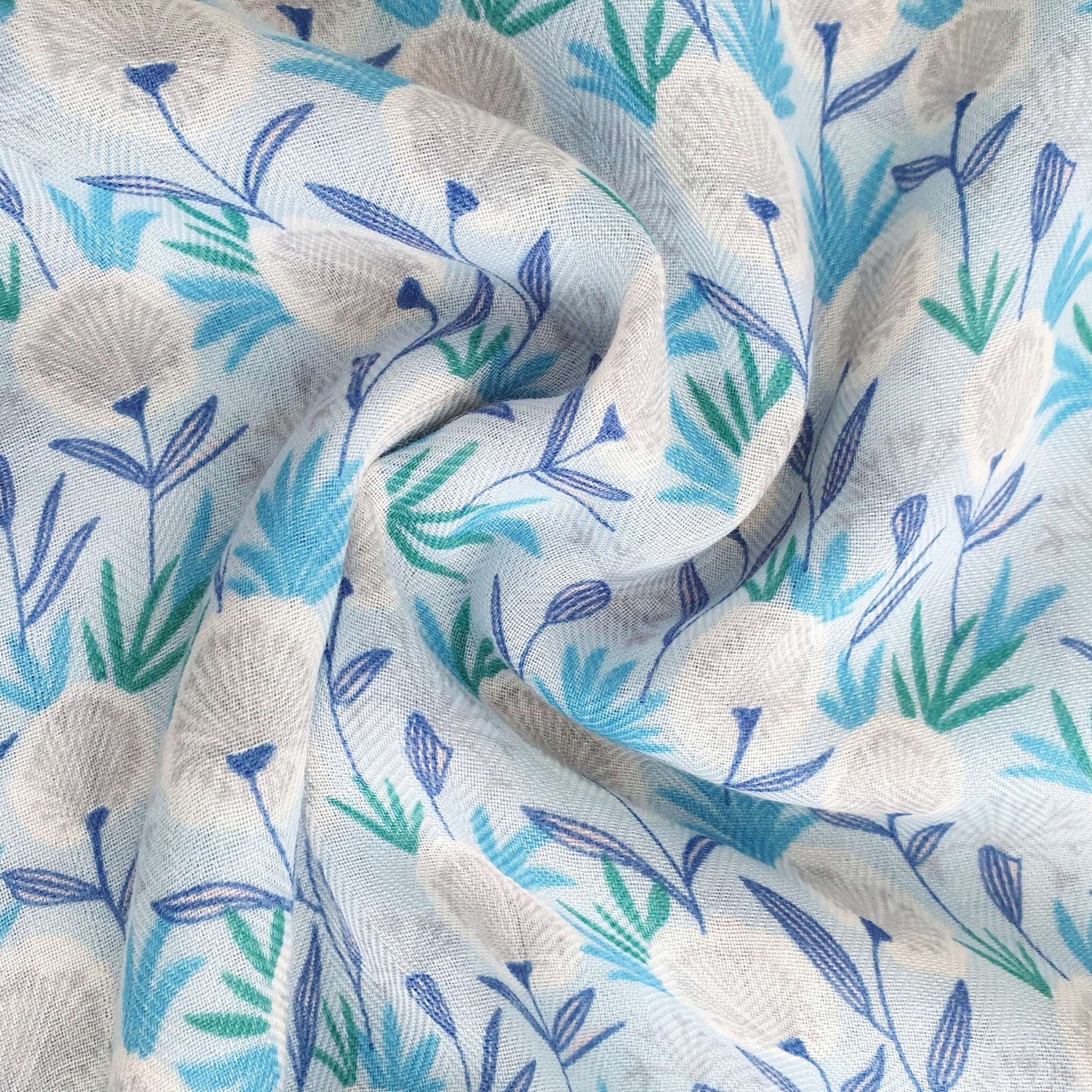 Lovely lightweight scarf adorned with a beautiful floral dandelion print in shades of blue, turquoise, green, white, and grey. Complete with fringe detailing on the shorter edges, this versatile piece is perfect for any occasion - whether it be a special birthday, a thoughtful present for a loved one, or simply a treat for yourself. Perfect for gardeners or anyone who loves nature.