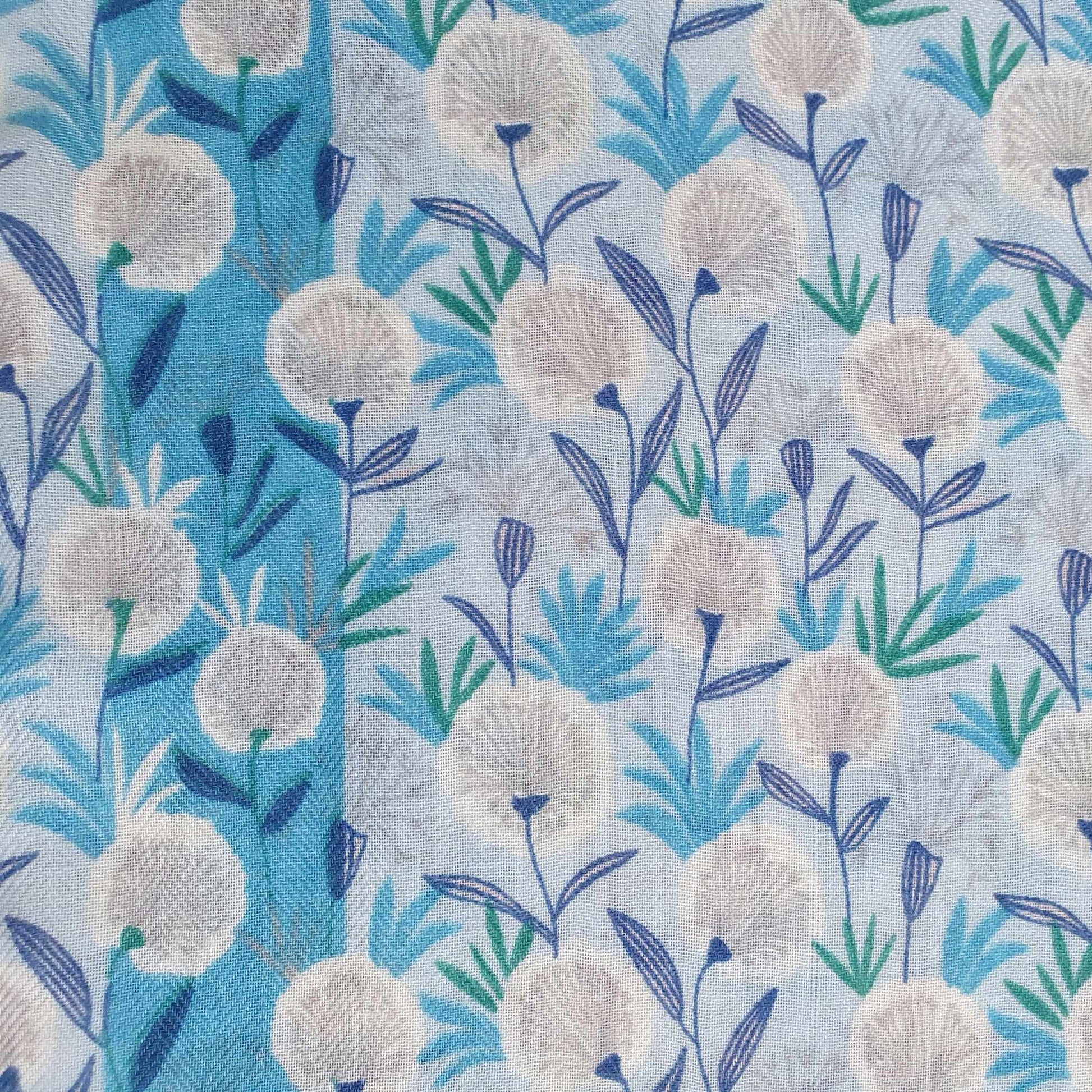 • Pretty dandelion print in shades of blue, turquoise, green, grey and white.