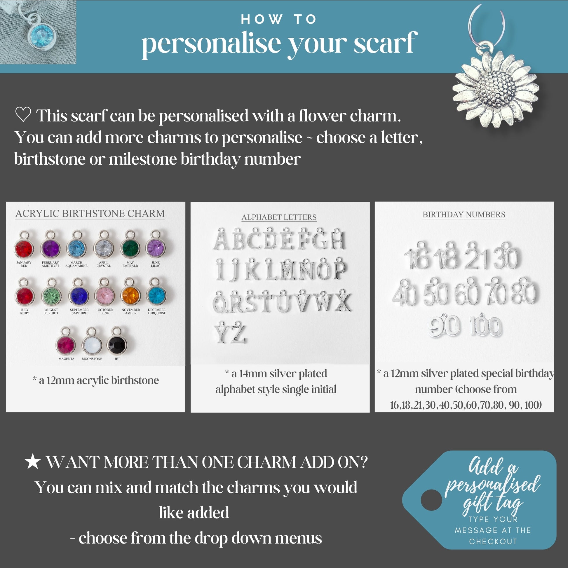 Choose extra charms attached with a silver plated ring to the corner of the scarf
