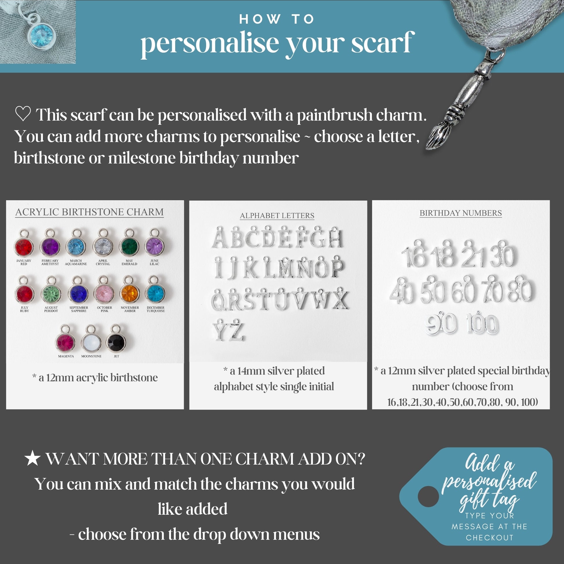 Choose extra charms from the options menu to personalise your scarf. Charms are attached with a silver plated ring to the corner of the scarf