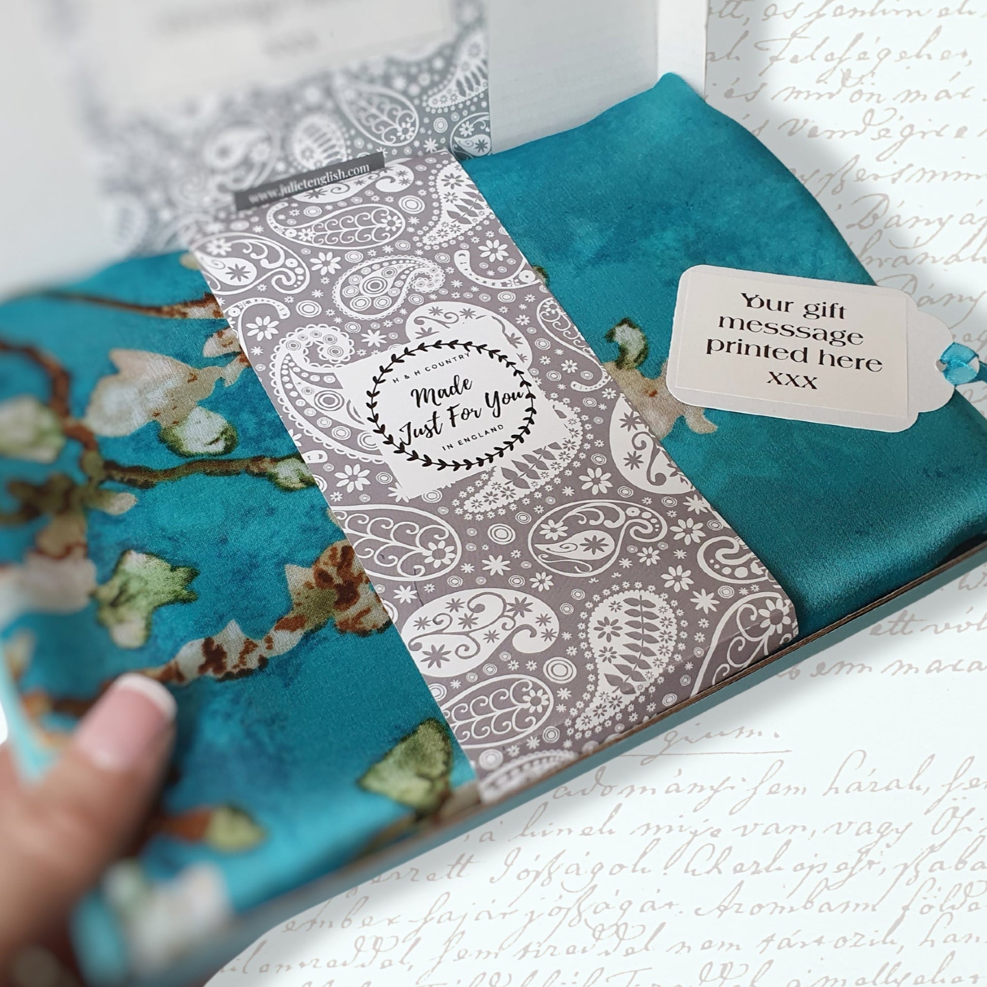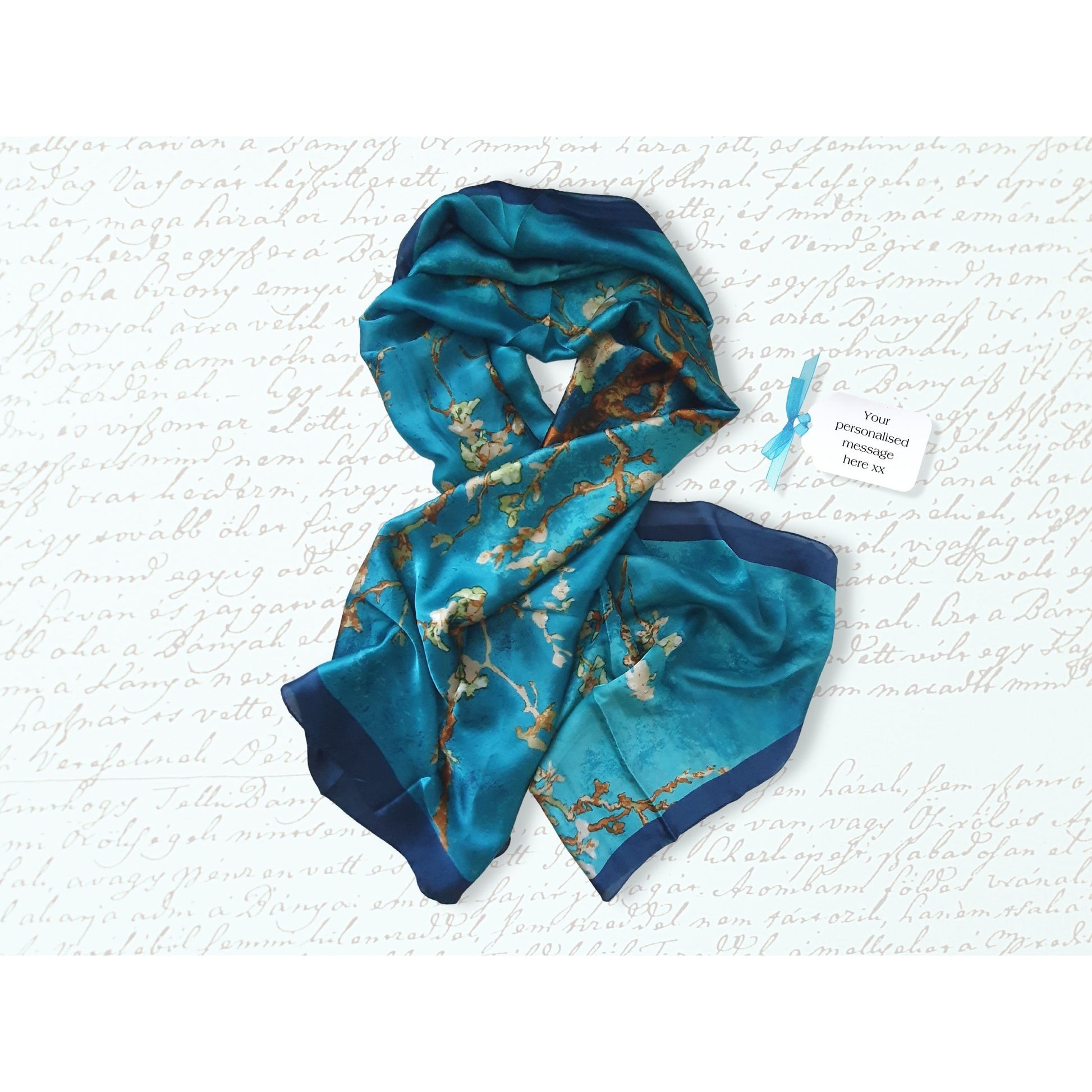 Measuring 180cm x 90cm, this handmade scarf is crafted from quality 100% silk. You can also opt for an additional gift tag featuring a personalized message. Our signature candy striped bag or optional hinged lid box with a ribbon tying complete the package.