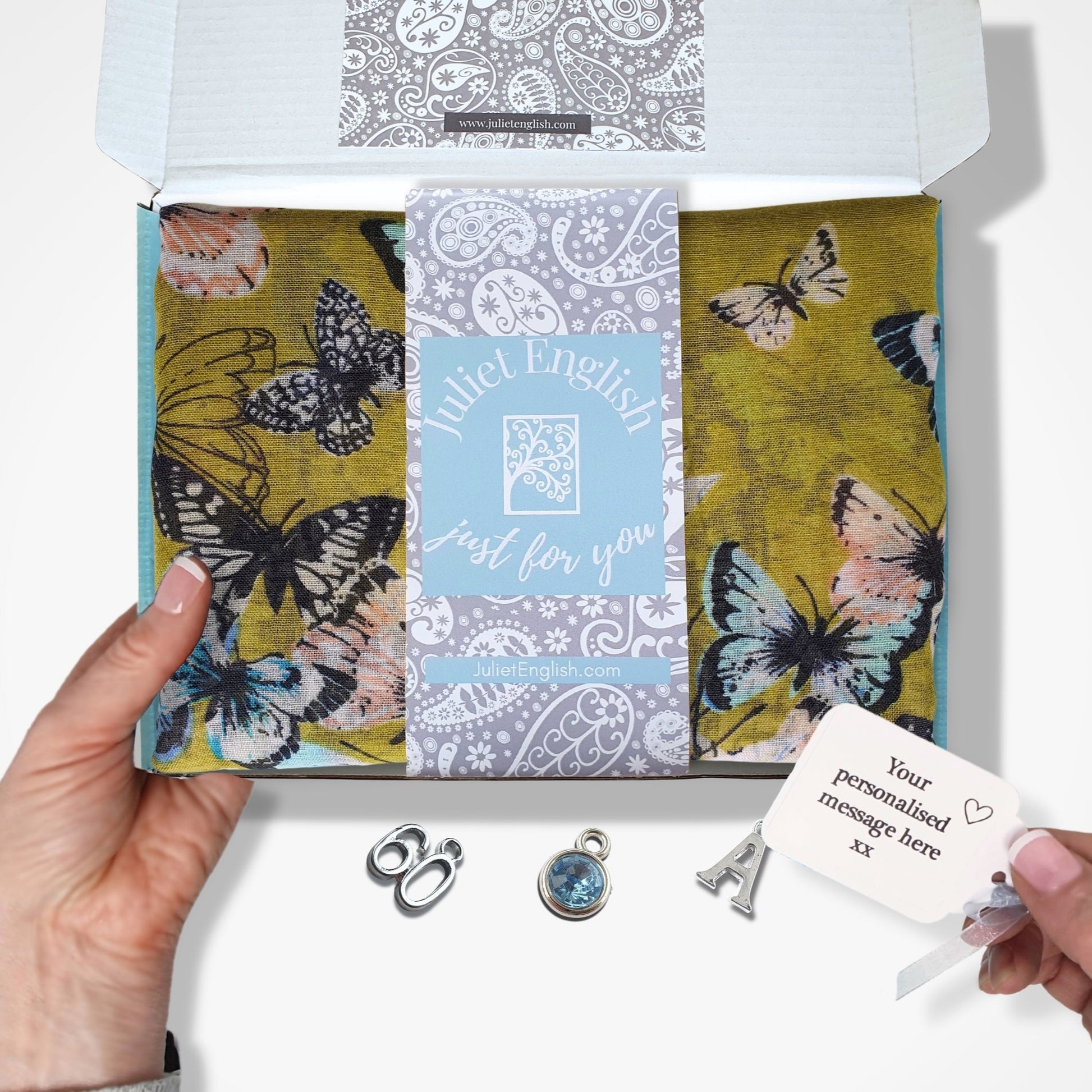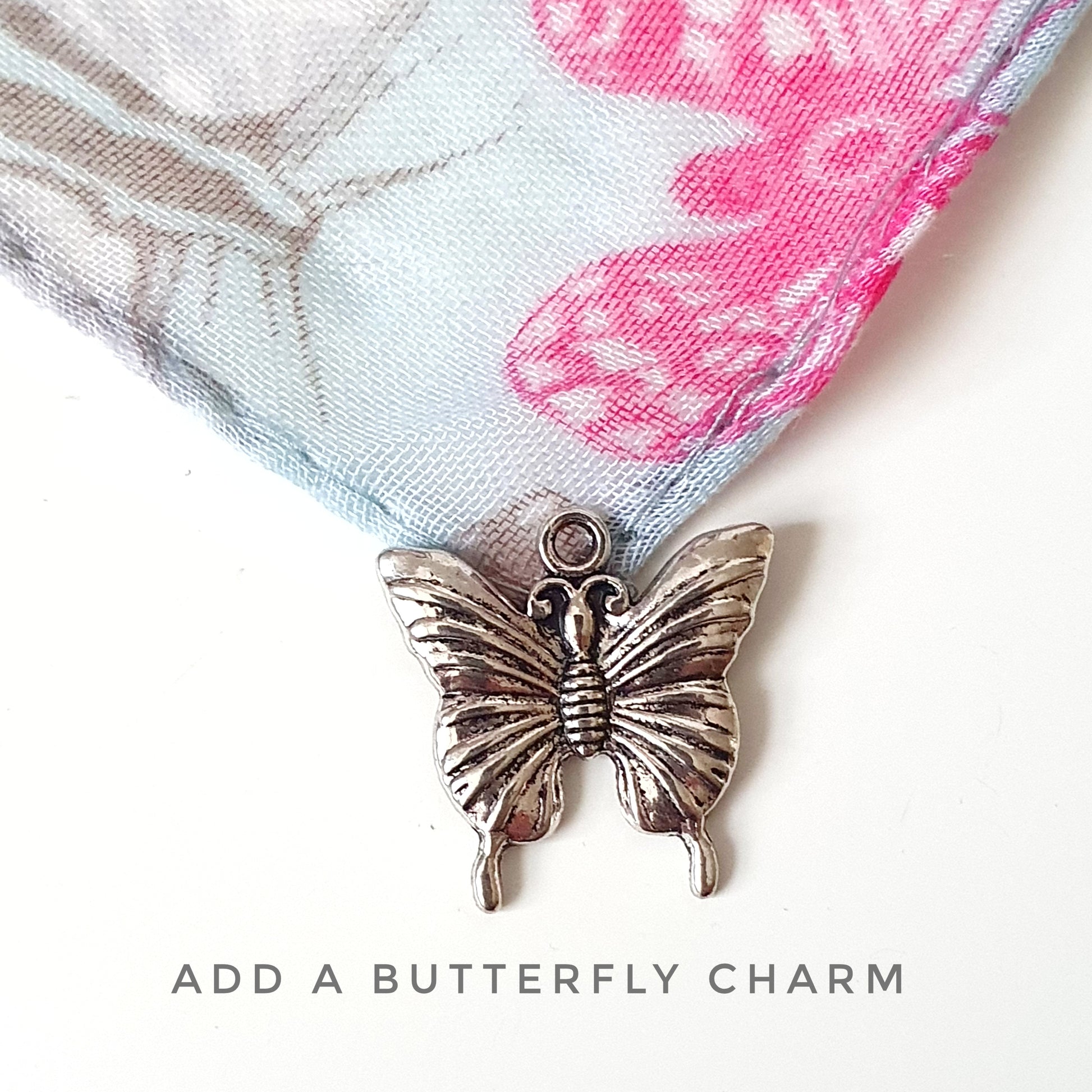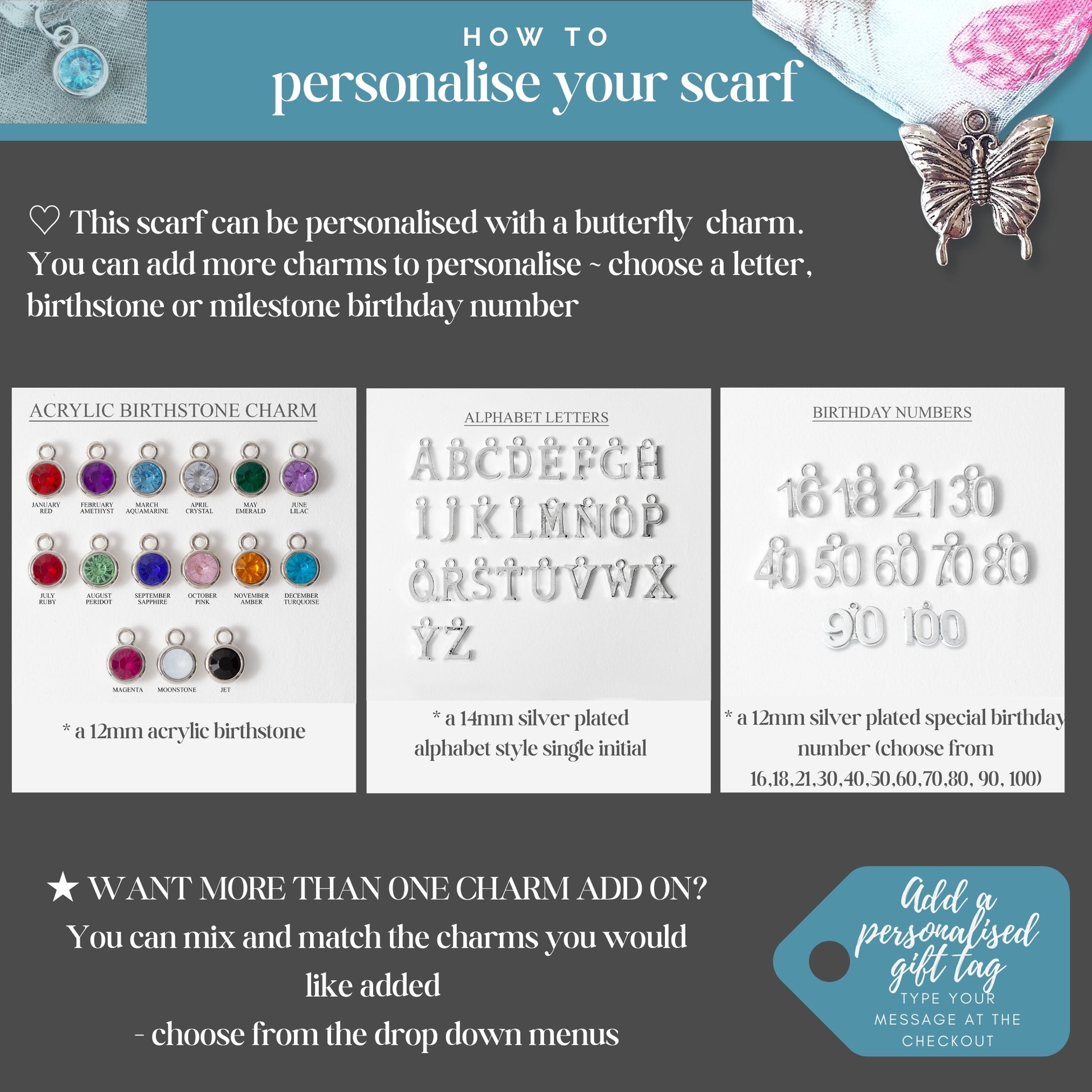 • Choose extra charms from the personalisation menu. Charms are attached with a removable silver plated ring to the corner of the scarf
