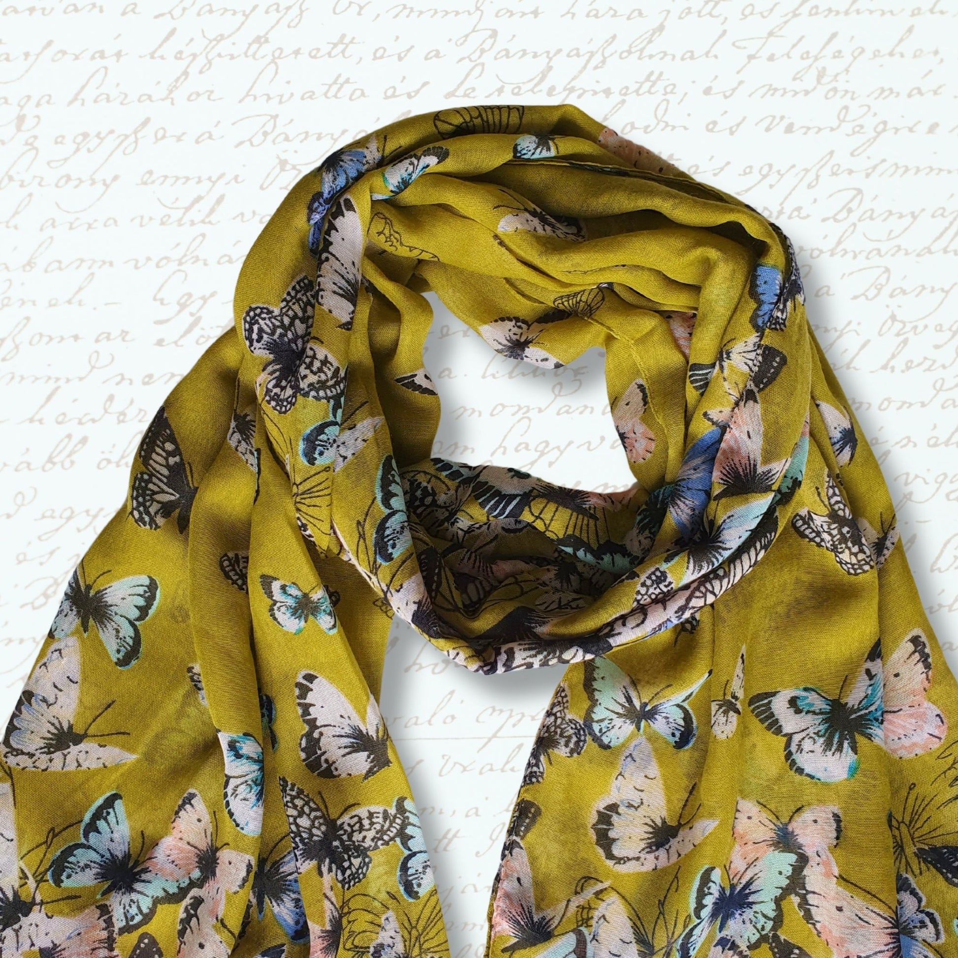 Butterfly design scarf in yellow-green background with vintage butterflies print. A soft women's butterfly scarf, large and lightweight, can be worn as a scarf or wrap and makes a lovely gift for a gardener, nature lover, for a wife or girlfriend, mother or grandma.